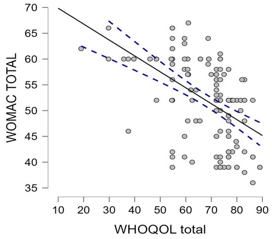 Inverse correlation between WOMAC total score and WHOQOL-BREF total score.