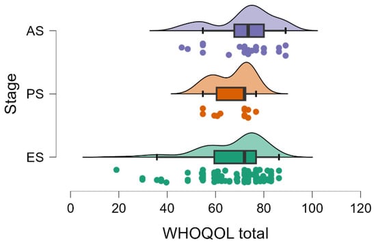 QoL assessed by the WHOQOL-BREF questionnaire was generally moderately impaired. The total WHOQOL-BREF score had a mean value of 67.9 ± 13.1 (on a scale of 0–100, where higher values indicate better QoL). Individual total score values varied over a wide range (minimum 19, maximum 89), with a median of 72 (Table 2).