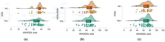 Analysis of the WHOQOL-BREF total score according to OA location showed that patients with KOA reported a significantly lower QoL compared to those without this condition (66.48 ± 12.73 vs. 71.76 ± 13.31, p = 0.006) (Figure 5a). Also, patients with concurrent hip and knee impairment had significantly lower WHOQOL scores than those with single impairment (65.93 ± 12.91 vs. 69.82 ± 13.0, p = 0.043) (Figure 5b). In contrast, patients with isolated HOA did not show a significant difference from others in terms of self-reported QoL (67.99 ± 13.35 vs. 67.83 ± 12.42, p = 0.754) (Figure 5c).