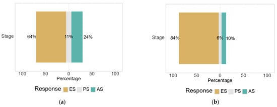 The only significant difference between sexes was observed in the distribution of clinical stages of OA (Figure 6). A significantly higher percentage of women were in the progressive stage (84.1% vs. 64.3% in men), while men were more frequently represented in the early stages and advanced stages (p = 0.032), suggesting a possible variation in disease progression or presentation behavior.