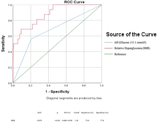 Figure 1. Receiver operator characteristic (ROC) curve for SHR predicting in-hospital ST. AH: admission hyperglycemia, AUC: Area Under Curve, SHR: stress hyperglycemia ratio. AUC = 0.879 (95% CI: 0.800–0.958), cutoff ≥ 1.26 yielded 75% sensitivity and 77.8% specificity.