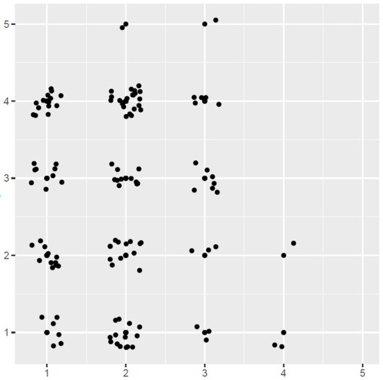 Correlation between patient- and physician-rated urgency. Scatterplot showing relationship between patient-perceived and physician-assessed urgency (1 = immediate, 2 = within 1 h, 3 = within 1–2 days, 4 = within 1 week, and 5 = non-urgent/months). Jittering was applied to improve visibility.