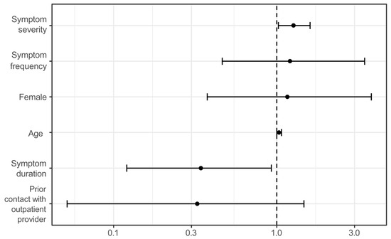 Odds ratios for high patient-perceived urgency. Multivariable logistic regression analysis of patient characteristics associated with high perceived urgency (score 1–2 on a 5-point scale). Odds ratios (ORs) and 95% confidence intervals (CIs) are shown for each predictor. Significant associations were observed for increasing age, higher symptom severity, and shorter symptom duration. Prior contact with an outpatient provider showed a non-significant trend toward lower perceived urgency.