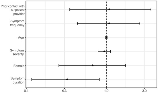 In contrast, physician-rated urgency was not significantly influenced by age (OR = 1.002; 95% CI: 0.979–1.025), gender (OR = 0.673; 95% CI: 0.254–1.735), symptom severity (OR = 0.941; 95% CI: 0.785–1.126), frequency (OR = 1.084; 95% CI: 0.434–2.612), or prior contact (OR = 1.086; 95% CI: 0.347–3.601). However, longer symptom duration significantly predicted lower urgency (OR = 0.324; 95% CI: 0.116–0.816) (Figure 3).