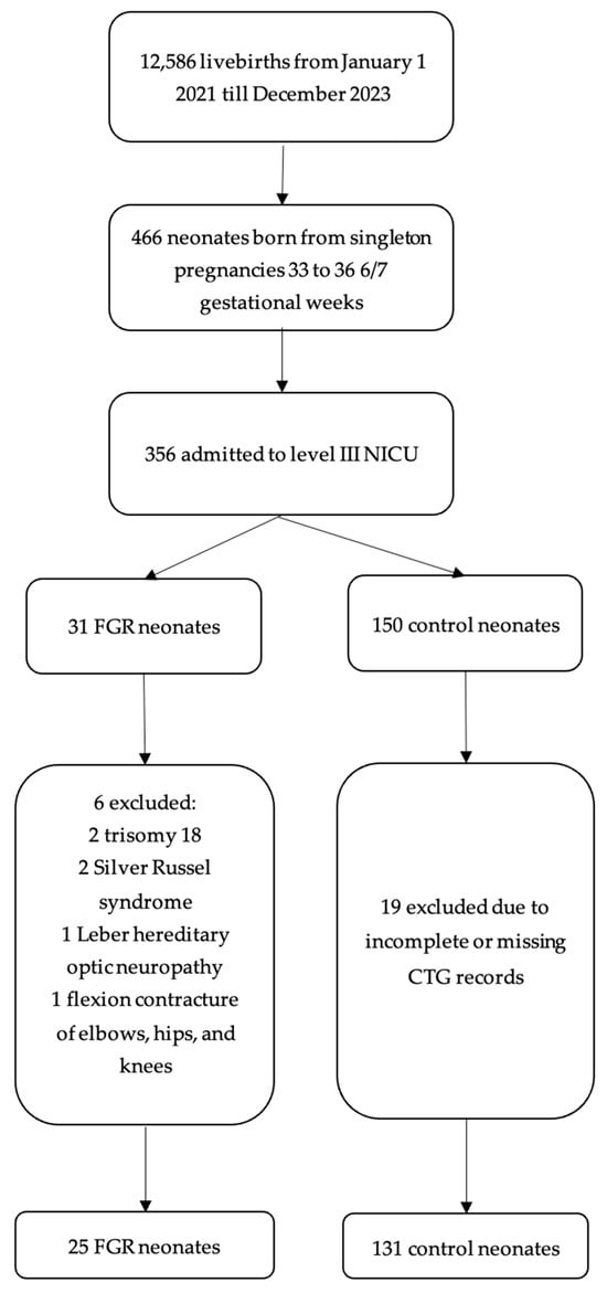 We aimed to investigate the differences in neonatal outcomes between the FGR and control groups, as well as the correlation between three-tiered FHR categorization and respiratory outcomes, the use of vasoactive medications, and fresh frozen plasma transfusions in moderate to late preterm neonates admitted to level III NICU.