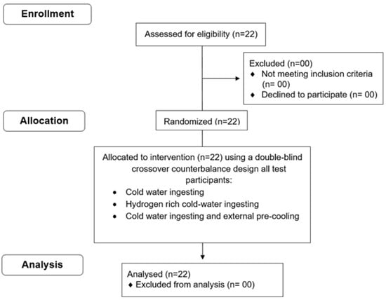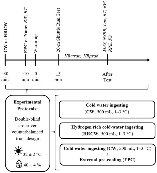 During experimental sessions, a double-blind, counterbalanced crossover design was used, involving the three following conditions: (1) ingestion of 500 mL of hydrogen-rich cold water (HRCW) before warm-up; (2) ingestion of 500 mL of cold water and external pre-cooling of lower limb muscles (IEPC) before warm-up; (3) and ingestion of 500 mL of cold water (control).