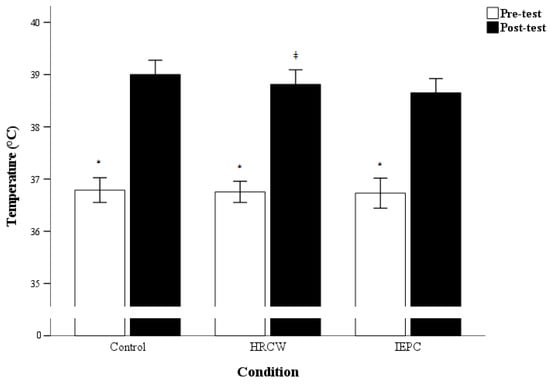 Contrast analysis revealed a significant decrease in body temperature during the IEPC condition compared to the control (p = 0.001) condition.