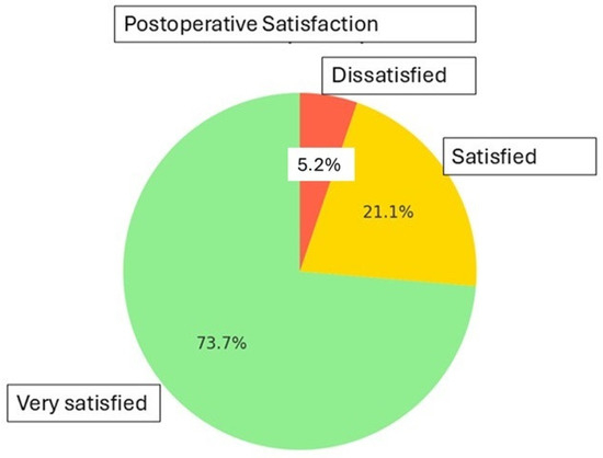 Regarding persistent or new-onset symptoms, two patients (5.3%) developed de novo urgency urinary incontinence and three patients (7.9%) reported persistent dyspareunia. Despite these findings, overall satisfaction with the procedure was high. According to the Likert scale, 73.7% of patients (n = 28) reported being “very satisfied,” 21.1% (n = 8) “satisfied,” and only 5.3% (n = 2) expressed dissatisfaction with the surgical outcome. (Table 4 and Figure 1)