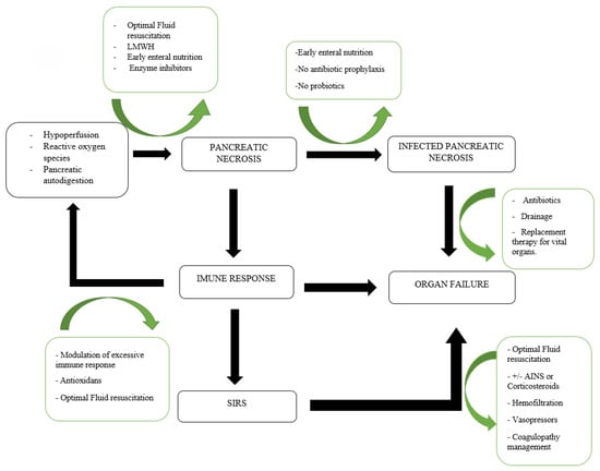 From pancreatic necrosis to organ failure: the role of infection and systemic inflammatory response syndrome (SIRS) and potential therapeutical interventions.