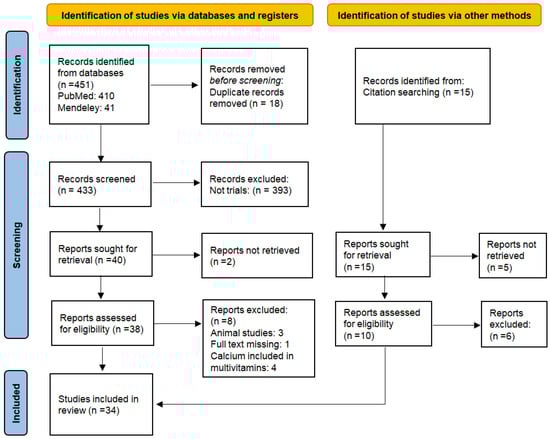 Figure 1 presents a flow diagram of the search and selection process. A total of 451 publications were initially identified. After removal of duplicates, 433 articles were considered eligible for title and abstract screening. Of these, 393 articles were excluded according to the eligibility criteria. Consequently, 40 studies were sought for retrieval, and 38 studies were retrieved. Eight studies were excluded for the following reasons: animal studies (n = 3), full text was missing (n = 1), and calcium was contained in multivitamin preparations (n = 4). Additionally, references from the included studies and other relevant studies published in high-impact journals were hand-searched, leading to the inclusion of four more papers. Thus, a total of 34 studies were included investigating the association between calcium supplementation and maternal or fetal/neonatal outcomes. In detail, 14 studies evaluated the association between calcium intake and PIH, 11 studies assessed the incidence, risk, and/or severity of PE, 7 studies explored the association between calcium and preterm birth, 4 studies investigated serum calcium levels, and 3 studies evaluated the association with systolic/diastolic blood pressure (BP) and birth weight. Only two studies focused on fetal growth or bone mineral density (BMD). A summary of the characteristics of the included studies, along with their most important findings, is provided in Table 1.