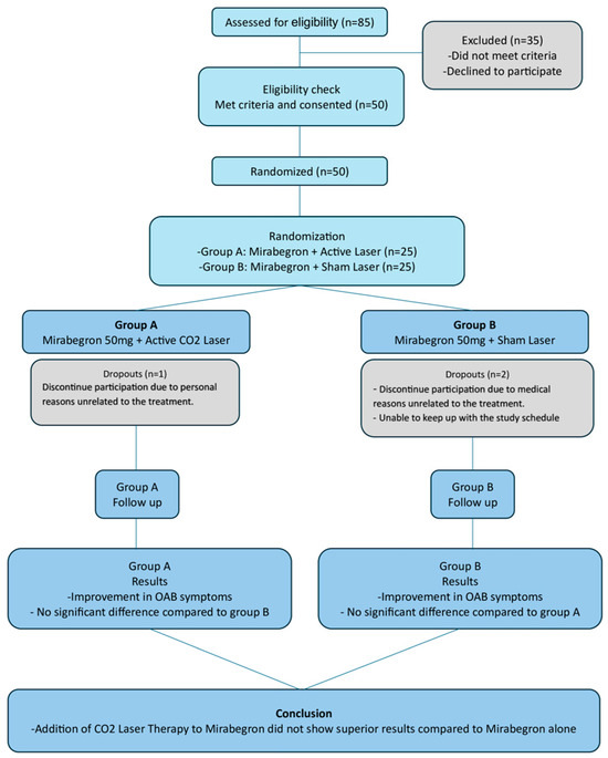 However, there are also limitations to be considered. The sample size, while calculated to achieve adequate power for detecting differences, may still be insufficient to observe small but clinically meaningful effects. In addition to this, given the small effect sizes and non-significant results, a post-hoc power analysis was not conducted, as it would offer limited additional value. Future multicenter studies with larger cohorts may provide more definitive evidence on the additive value of CO2 laser. Additionally, the duration of follow-up may not have been long enough to capture the long-term effects of laser therapy on OAB symptomatology. In particular, some therapeutic effects, especially those related to tissue regeneration and long-term symptom relief from CO2 laser therapy, might require a longer time to become apparent. A longer follow-up period could potentially reveal differences in the durability and sustained efficacy of the treatments that were not evident within the shorter timeframe. In addition to this, the study protocol included three monthly sessions at monthly intervals of fractional CO2 laser therapy. This is consistent with several previous trials investigating laser treatment for OAB and genitourinary syndrome of menopause (GSM) symptoms [20,23]. This might not have been sufficient to induce a noticeable therapeutic effect in managing OAB symptoms. Emerging data—particularly from studies in GSM—suggest a potential dose–response relationship, with improved outcomes observed after four or even five treatment sessions [13]. While a definitive dose–response curve has yet to be established, the incremental benefit of additional sessions warrants further investigation, particularly in patients with more severe symptoms or in whom monotherapy with mirabegron is inadequate. Given the favorable safety profile of fractional CO2 laser therapy, exploring a higher number of sessions (up to five) or adjusting the treatment frequency in future randomized trials appears ethically feasible, especially when patient selection is guided by symptom severity and/or baseline GSM status. Future studies should aim to determine the optimal treatment frequency and assess whether extended laser therapy results in more durable or pronounced improvements. Another important limitation is the absence of a validated baseline assessment of GSM, such as the Vaginal Health Index (VHI) or Vaginal Maturation Index (VMI). Given that CO2 laser therapy has demonstrated greater efficacy in patients with symptomatic GSM, the lack of GSM stratification may have interfered with the ability to detect a differential response. While post-hoc subgroup analysis was considered, our sample size was insufficient to support statistically meaningful stratification. Future studies should incorporate objective GSM assessments to enable targeted evaluation of treatment effects in relevant subpopulations. Finally, a further study could explore extended regimens, particularly when CO2 laser is administered as monotherapy. To that end, further research should consider a 2 × 2 factorial design to distinguish between the independent and synergistic effects of CO2 laser and mirabegron, including the use of a mirabegron-naïve cohort for initial assessment.