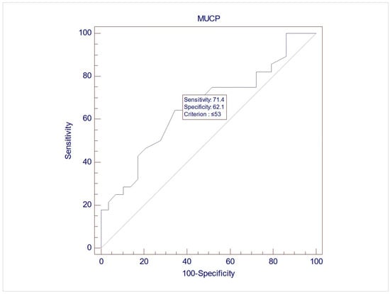 ROC graph of MUCP against USI diagnosis. AUC (area under the curve) = 0.663 (95%CI 0.525–0.782).
