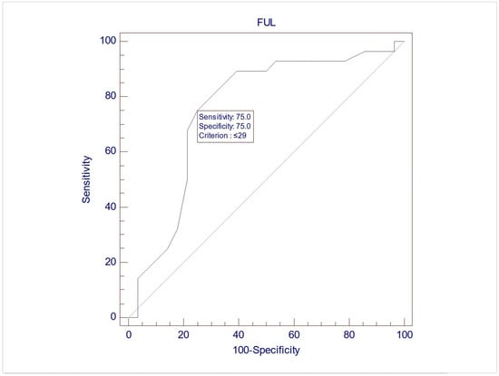 ROC graph of FUL against USI diagnosis. AUC (area under the curve) = 0.756 (95%CI 0.623–0.861).