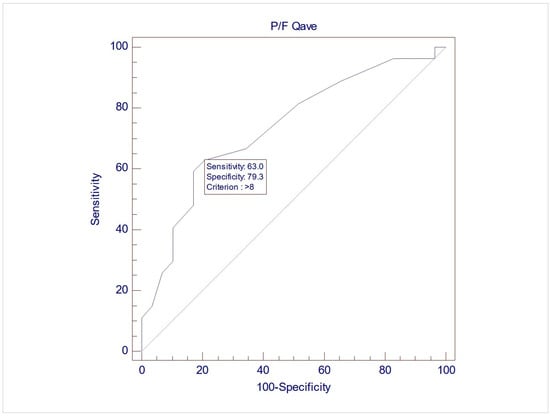 The records of 307 women were screened for inclusion, and eventually, 57 women were included in this study, with a mean age of 60.7 (±9.3). Upon UDS, 28 women (49.1%) demonstrated USI (Group 1), while 29 (50.9%) did not demonstrate USI (Group 2). No differences between the two groups were noted during free uroflowmetry and the filling phase of CMG. However, the women in Group 2 exhibited significantly lower MUCP, FUL, and post-void residuals after pressure flow compared to women in Group 1 (p = 0.038, 0.003, and 0.04, respectively, via Student’s t test for independent parameters) (Table 2). The ROC analysis indicated that when using MUCP and FUL for the diagnosis of USI, the AUCs are 0.663 (95%CI 0.525–0.782) and 0.756 (95%CI 0.623–0.861), respectively (Figure 1 and Figure 2). It appears that FUL measurements were the most accurate diagnostic metrics for USI confirmation. The average flow rate (Qave) also exhibited correlations relative to the diagnosis of USI with an AUC of 0.734 (95%CI 0.599–0.843), although this cannot be logically considered a diagnostic parameter (Figure 3).