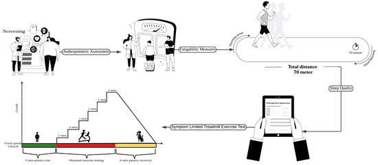 The participants then underwent a symptom-limited treadmill exercise test using the modified Balke protocol, as shown in Figure 1. Before the test, the participants’ HRs and BPs were measured. The participants were asked to wear a polar heart rate monitor (Polar H7, Kempele, Finland) to calculate their HRs during the test. A cardiopulmonary exercise test (CPET) was performed using a breath-by-breath gas analyzer device (Cortex Metalyzer 3B, Leipzig, Germany) to determine the amount of oxygen consumption (VO2), carbon dioxide (VCO2), and minute ventilation (VE), as shown in Figure 2. The test was performed on a treadmill, allowing for adjustments to speed and inclination. The participants were connected to a gas-analyzing metabolic cart (mouthpiece) to determine their oxygen uptake, ventilated VCO2, lung volumes, and HR. The choice of the modified Balke protocol is particularly suitable for populations with higher body mass. The literature supports that the modified Balke protocol minimizes initial physical fatigue while progressively increasing exercise load, making it safer and more bearable for overweight or less fit individuals [34,35]. This procedure provides more precise and reliable assessments of cardiorespiratory fitness and exercise tolerance in groups whose high-intensity protocols may result in premature testing due to tiredness or discomfort, thereby limiting the diagnostic value [36].