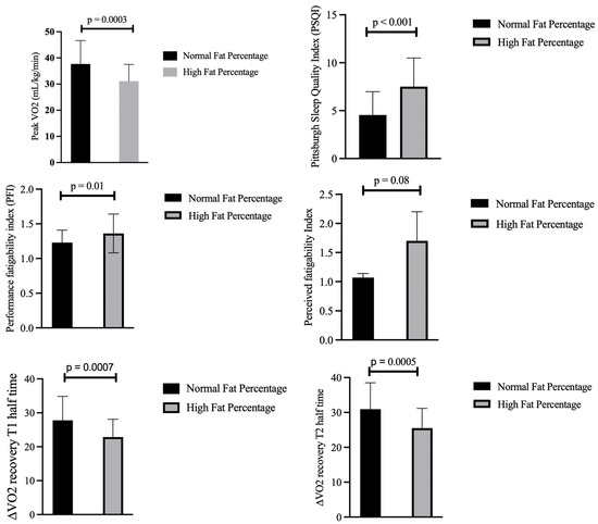 Furthermore, those with higher fat percentages exhibited greater performance fatigability (1.36 (SD = 0.28) versus 1.23 (SD = 0.18) in the normal-fat-percentage group (p = 0.01)) and reported poorer sleep quality. However, perceived fatigability did not differ significantly (p = 0.08), indicating that subjective fatigue measures may not fully align with physiological markers.