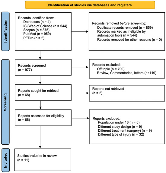 - Outcome: Studies reporting outcomes such as pain reduction at rest or during activity, improvement in quality of life, and return to activity or sport were included. Studies using the following validated scales or questionnaires were deemed eligible: the Visual Analogue Scale (VAS) and the Numeric Rating Scale (NRS) for pain-related outcomes; the Foot and Ankle Ability Measure (FAAM) divided into two subscales, i.e., FAAM-Sport and FAAM-ADL, for function-related outcomes and to evaluate functional capacity in sports and activities of daily living (ADL) for individuals with foot or ankle problems; and the Foot and Ankle Outcome Score (FAOS), used to assess clinical outcomes (symptoms, pain, ADL, sports and leisure activities, and quality of life) related to foot and ankle disorders.
