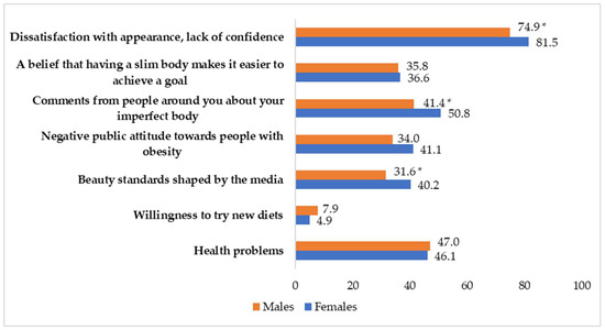 Proportion (%) of students who reported factors that encourage weight loss; *—p < 0.05 compared to females.