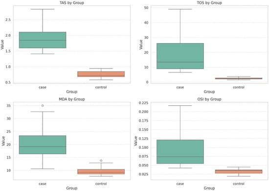 The median TOS level in the case group was 13.5 (IQR = 8.85–27.64), while the median TOS level in the control group was 2.37 (IQR = 2.10–2.82). The TOS levels in the case group were significantly higher than those in the control group (p < 0.001, Cohen’s d = 3.38, Eta squared (η2) = 0.74). The median OSI value in the case group was 0.073 (IQR = 0.053–0.128), whereas the median OSI value in the control group was 0.035 (IQR = 0.027–0.036) (p < 0.001, Cohen’s d = 3.34, Eta squared (η2) = 0.74). In terms of TAS values, the mean TAS value in the case group (1.92 ± 0.37) was significantly higher than that in the control group (0.75 ± 0.09) (p < 0.001, Cohen’s d = 4.34, r = 0.90). Similarly, the mean MDA value in the case group (20.70 ± 6.14) was higher than that in the control group (9.64 ± 1.46) (p < 0.001, Cohen’s d = 2.48, r = 0.78). Comparative analysis of TAS, TOS, MDA, and OSI parameters between the fibromyalgia patients and the healthy control group is shown in the figure (Figure 1).