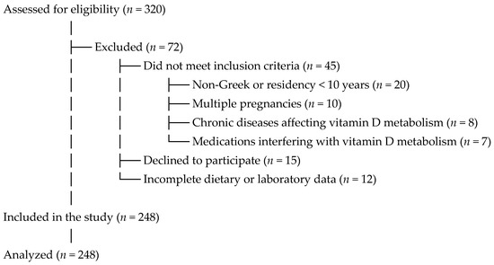 Exclusion criteria were as follows: women prescribed vitamin D supplements at doses greater than 800 IU/day; women using medications known to interfere with vitamin D metabolism (e.g., corticosteroids, anticonvulsants, antituberculosis agents, antifungals), women with multiple pregnancies (twins or more); presence of chronic diseases affecting vitamin D metabolism (e.g., kidney or liver disease); non-Greek nationals or residents in Greece for less than 10 years, and those who declined to provide informed consent or had incomplete dietary or laboratory data.
