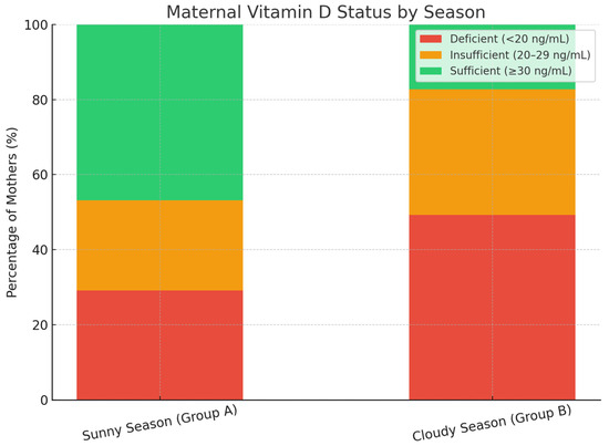 Vitamin D levels varied significantly by season. During winter, the mean maternal 25(OH)D concentration was 16.96 ± 9.6 ng/mL, compared to 24.22 ± 12.57 ng/mL in summer. Deficiency or insufficiency affected 89% of women in winter versus 75% in summer. This difference was statistically significant (χ2 = 6.87, p = 0.009), as shown in Table 4. A more detailed breakdown of seasonal differences is shown in Figure 2, which presents the proportion of mothers classified as vitamin D deficient, insufficient, or sufficient during the sunny and cloudy seasons. Notably, vitamin D sufficiency was markedly higher in the sunny season (46.8%) compared to the cloudy season (17.3%), while deficiency was more prevalent in the latter (49.3%).