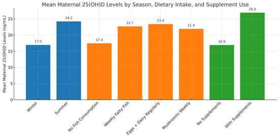 Further subgroup analysis revealed that the combination of consistent vitamin D supplementation (≥600 IU/day), frequent intake of vitamin D-rich foods, and regular sun exposure (>30 min/day) resulted in the highest maternal 25(OH)D levels at delivery (30.87 ± 11.94 ng/mL), with only 9.5% of these women remaining deficient. In contrast, women who received no supplements and relied only on diet and sunlight had significantly lower mean 25(OH)D levels (18.43 ± 9.61 ng/mL), and 67% were vitamin D deficient. Women who took supplements but had poor dietary habits and minimal sun exposure still had relatively elevated levels (25.12 ± 12.09 ng/mL), while those lacking all three inputs had the lowest mean levels (14.78 ± 8.23 ng/mL), with 85% remaining deficient. These intergroup differences were statistically significant (ANOVA F(3,244) = 18.21, p < 0.001) (Table 7). A visual overview of these combined effects is presented in Figure 3, which illustrates the mean maternal 25(OH)D levels by season, dietary habits, and supplement use. The highest concentrations are observed among women with favorable conditions across all three domains, whereas those with poor exposure and intake exhibit markedly lower levels (Figure 3).