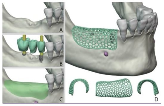 Kim et al. conducted a randomized study with a customized 3D-printed ceramic bone graft, where they used CAD software to design a patient-specific bone graft based on radiographic and computed tomography scans []. Similarly, Tallarico et al. [] conducted a case study of a customized 3D-printed titanium mesh for an alveolar ridge because of sever. This process followed a three-step process: first, a computed tomography scan was acquired; STL files were then derived from the DICOM data for analysis; and the customized titanium mesh was designed using CAD/CAM software according to the virtual planning of the target area. The final titanium mesh was 3D-printed and obtained from New Ancorvis Srl. In another study, Ivanovski et al. used a similar framework to design and verify a scaffold over a contour of missing bone for a staged alveolar bone augmentation before implant placement []. A computed tomography scan was used to generate an STL file of the defect, which was then used to design the scaffold, and verified by segmenting the area to ensure an accurate fit. The final scaffold was fabricated using bioprinting.
