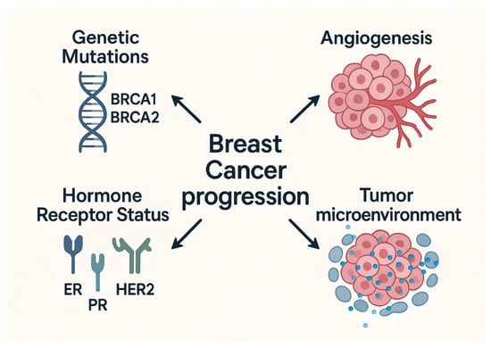 BC development and progression are driven by key biological hallmarks such as genetic mutations, hormone receptor (HR) status, the tumor microenvironment, and angiogenesis, as shown in Figure 1 [].