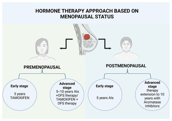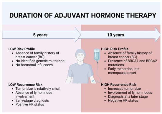 Nearly all women with ER-positive BC are candidates for adjuvant endocrine therapy for a minimum of five years. However, HT can be extended up to 10 years, usually in patients with larger initial tumors, higher-grade tumors, lymph node involvement, or other factors that suggest a higher recurrence risk. Endocrine therapy has proven its efficacy as a valuable adjuvant therapeutic tool in HR-positive BCs due to its ability to target the estrogen and/or progesterone receptors (ER and PR) in order to inhibit cancer growth [].