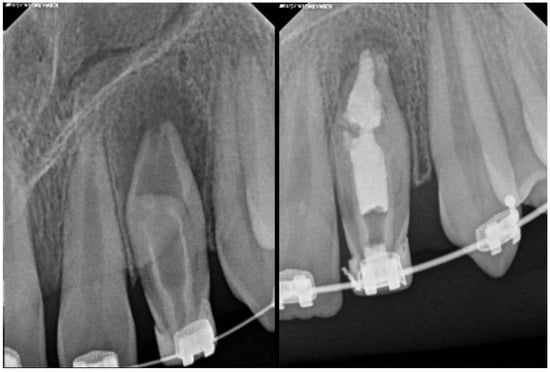 - Soares, J.; Santos, S.; Silveira, F.; Nunes, E. Calcium hydroxide barrier over the apical root-end of a type III dens invaginatus after endodontic and surgical treatment. Int. Endod. J. 2007, 40, 146–155. [Google Scholar] [CrossRef] [PubMed]