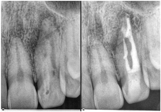 Radiographic features of Oehlers Type II dens invaginatus case in lateral incisor before (left) and after (right) treatment (courtesy of C.A.).