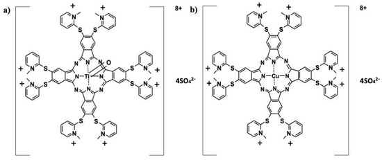 2-Mercaptopyridine was purchased from Fluka (AG, Buchs, Switzerland). 4,5-Dichlorophthalonitrile and 4,5-bis (2-mercaptopyridine)phthalonitrile were synthesized and purified according to the procedures described in the literature [12,13]. The water-soluble octa-mercaptopyridine-substituted copper (II) (CuPc) sulfate (Figure 1) phthalocyanine compound used in this study was synthesized and characterized by our group in previously published work [14]. The chemical structures of the studied compounds are shown in Figure 1a (oxo-TiPc) and Figure 1b (CuPc).