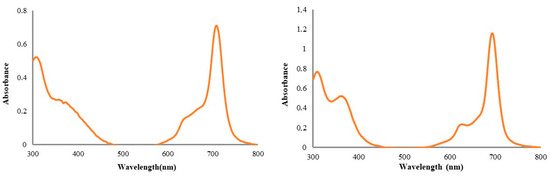 We worked with mercaptopyridine-substituent Pc compounds containing Cu and Ti central atoms for cytotoxicity studies. Generally, the UV-Vis spectra of the phthalocyanine derivatives are consistent with equilibrium between monomeric and dimeric–multimeric forms in an aqueous solution [17]. Aggregation behavior is important for the use of Pc compounds in bioapplications. It has long been thought that the aggregation of phthalocyanines has negative consequences for PDT [18,19]. The studied (oxo-TiPc) and (CuPc) derivatives did not exhibit aggregation in water (Figure 2).