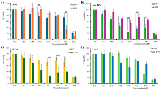 Dose/response curves showing light-stimulated cytotoxic effects of (a) oxo-TiPc on SCC-9, (b) oxo-TiPc on L-929, (c) CuPc on SCC-9, and (d) CuPc on L-929 cell lines in the Pc + light and control groups. Pc-only and light-only groups showed >90% viability (see text). Statistical analysis was performed using one-way ANOVA with Tukey’s post hoc test (* p < 0.05, ** p < 0.01, *** p < 0.001, **** p < 0.0001).