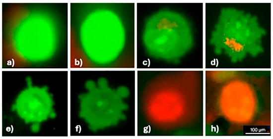 Apoptosis in the SCC-9 cell line detected using AO/EB dual staining. Images show the following: (a,b) live cells (uniform green fluorescence), (c–f) apoptotic cells (green/orange fluorescence with chromatin condensation), (g,h) necrotic cells (uniform red fluorescence). All images were captured at 40× magnification under a fluorescence microscope with a 100 µm scale bar.