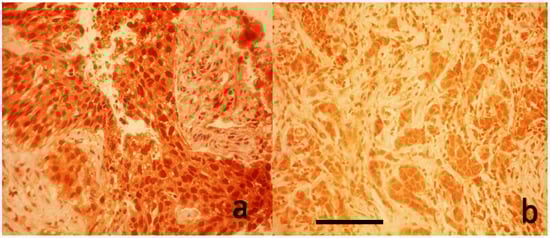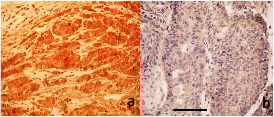 Immunohistochemical analysis of cytoplasmic YAP1 expression in breast carcinoma tissues. (a) High cytoplasmic YAP1 staining. (b) Weak cytoplasmic YAP1 staining (DAB with hematoxylin counterstain, original magnification 40×, scale bar represents 100 μm).