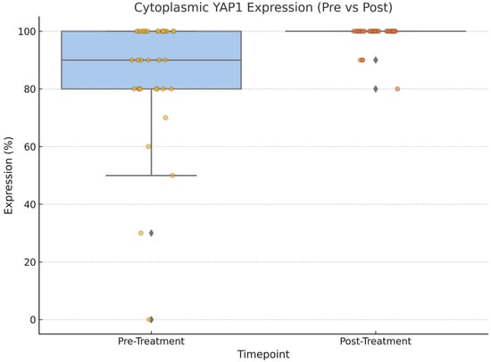 Cytoplasmic YAP1 expression before and after neoadjuvant chemotherapy. A significant increase was observed post treatment (Wilcoxon signed-rank test, p = 0.002).