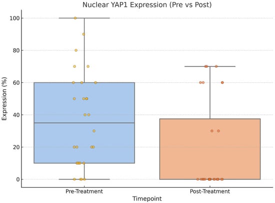 Nuclear YAP1 expression before and after neoadjuvant chemotherapy. A significant decrease was observed post treatment (Wilcoxon signed-rank test, p = 0.004).