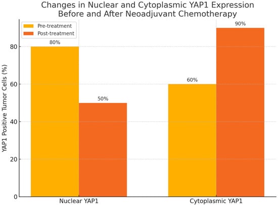 In our cohort, neoadjuvant chemotherapy led to a statistically significant decrease in nuclear YAP1 expression (p = 0.004) and a concomitant increase in cytoplasmic localization (p = 0.002), suggesting dynamic spatial modulation of YAP1 in response to treatment. This shift, however, is reversible: matrix stiffness, growth factor signaling, or taxane withdrawal can rapidly reactivate nuclear YAP1, which may reflect altered transcriptional activity and therapeutic vulnerability. Therefore, the post-NAC cytoplasmic pool likely represents an adaptive dormancy rather than permanent inactivation—a finding that supports therapeutic strategies aimed at blocking nuclear re-import or accelerating cytoplasmic degradation after chemotherapy.
