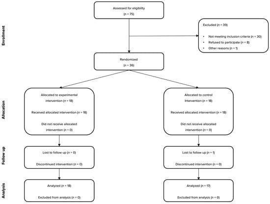 A total of 35 participants (n = 35; 23 females) were randomly assigned to the intervention or control group, received the allocated supplementation, and were included in the primary outcome analysis. Of these, 18 participants (12 females) were in the experimental group, and 17 participants (11 females) were in the control group. The flow of participants through each stage of the randomized trial is depicted in Figure 1.