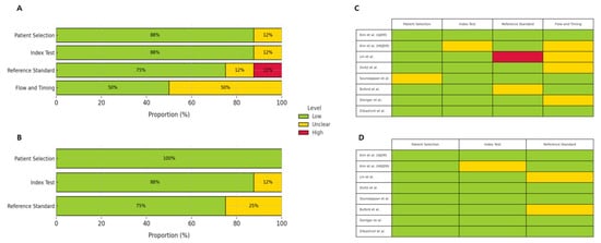 - Whiting, P.; Rutjes, A.W.; Reitsma, J.B.; Bossuyt, P.M.; Kleijnen, J. The development of QUADAS: A tool for the quality assessment of studies of diagnostic accuracy included in systematic reviews. BMC Med. Res. Methodol. 2003, 3, 25. [Google Scholar] [CrossRef]