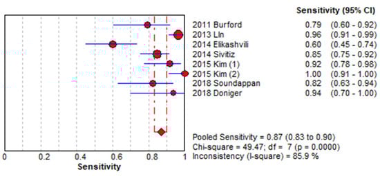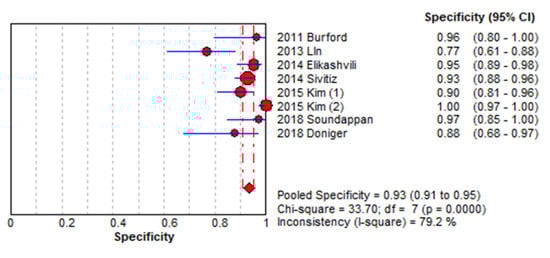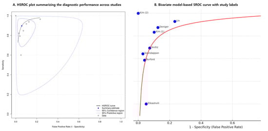 - Zamora, J.; Abraira, V.; Muriel, A.; Khan, K.; Coomarasamy, A. Meta-DiSc: A software for meta-analysis of test accuracy data. BMC Med. Res. Methodol. 2006, 6, 31. [Google Scholar] [CrossRef]