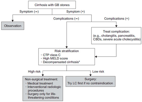 - Wang, S.Y.; Yeh, C.N.; Jan, Y.Y.; Chen, M.F. Management of Gallstones and Acute Cholecystitis in Patients with Liver Cirrhosis: What Should We Consider When Performing Surgery? Gut Liver 2020, 15, 517–527. [Google Scholar] [CrossRef] [PubMed]