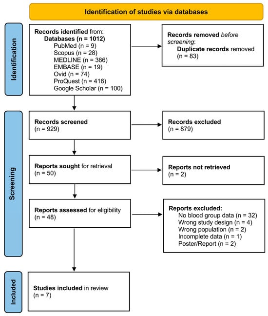 A total of 1012 records were initially identified through database searches, including PubMed (n = 9), Scopus (n = 28), MEDLINE (n = 366), EMBASE (n = 19), Ovid (n = 74), ProQuest (n = 416), and Google Scholar (n = 100). After removing 83 duplicates, 929 studies remained for screening based on their titles and abstracts. Of these, 879 studies were excluded due to irrelevance to the research question. A total of 50 reports were sought for retrieval, with 2 reports not retrieved. Ultimately, 48 full-text articles were then assessed for eligibility. Of these, 32 reports were excluded due to the absence of blood group data, 4 due to wrong study design, 2 for wrong population, 1 due to incomplete data, and 2 for wrong publication types (poster/report). Finally, a total of 7 articles were included in this review [,,,,,,]. Flow diagram of the study selection process is shown in Figure 1.