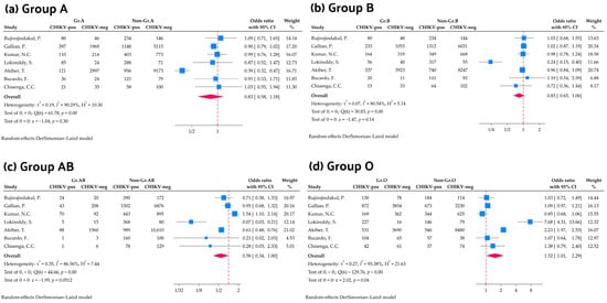 Forest plots illustrate the odds of CHIKV infection among individuals with blood groups (a) A, (b) B, (c) AB, and (d) O using a random-effects model [,,,,,,].