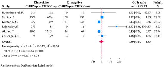 Forest plot illustrates the odds of CHIKV infection among individuals with Rh-positive and Rh-negative blood groups using a random-effects model [,,,,,].
