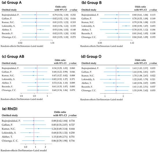 Sensitivity analysis using the leave-one-out method demonstrates the effects of each individual study on the meta-analysis results for blood groups (a) A, (b) B, (c) AB, (d) O, and (e) Rh(D) [,,,,,,].