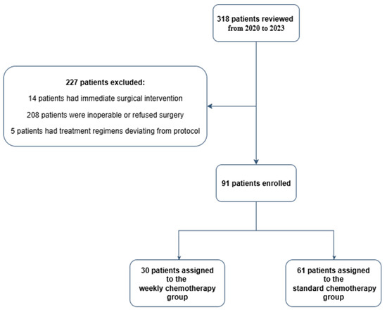 A total of 91 patients were included in this retrospective cohort study, with 61 patients in the standard chemotherapy group and 30 patients in the weekly chemotherapy group.