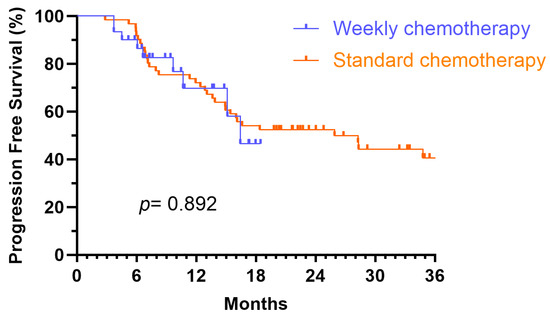 For OS, the univariate analysis revealed PNI as the only significant prognostic factor (HR: 4.75; 95% CI: 1.76–12.83; p = 0.002). However, no factors remained significant in the multivariate analysis for OS. Notably, the choice of chemotherapy regimen (standard chemotherapy group vs. weekly chemotherapy group) did not significantly impact PFS (HR: 1.11; 95% CI: 0.52–2.39; p = 0.787) or OS (HR: 0.60; 95% CI: 0.13–2.71; p = 0.507) in the univariate analysis.