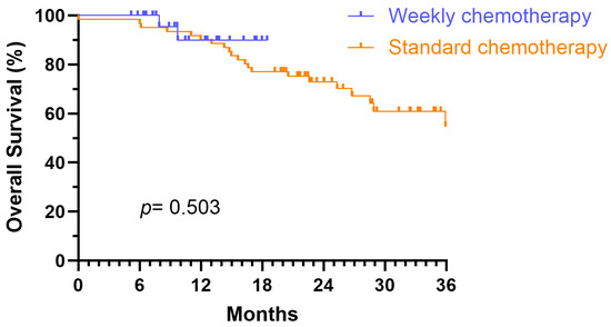 Weekly chemotherapy schedules offer several practical advantages over standard regimens, including reduced acute toxicity, improved patient compliance, and decreased hospitalization requirements. The approach allows for more frequent monitoring of treatment tolerance and earlier detection of adverse effects. The current evidence suggests that achieving minimum effective cumulative doses is more critical than the cycle intensity, with high-dose regimens potentially increasing toxicity without clear survival benefits over weekly approaches. In our study, both regimens demonstrated excellent compliance rates (100% vs. 96.67%), with comparable overall toxicity profiles, although the standard group experienced slightly higher severity grade 2–3 hematologic toxicities. The single discontinuation in the weekly group was due to personal preference rather than severe toxicity, indicating that both treatments were well-tolerated. This suggests that the observed superiority in outcomes is not primarily attributable to differential treatment completion or toxicity-related dose reductions, pointing to alternative biological mechanisms underlying the weekly regimen’s efficacy.
